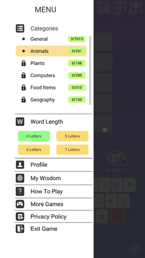 1. Choose whether a 4, 5, 6, or 7-letter game from the display on the screen.
