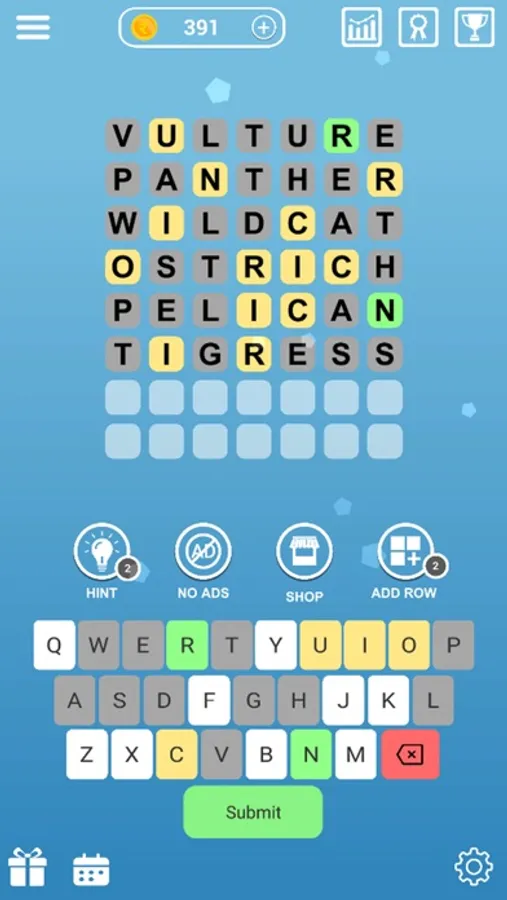 5. You can purchase hints to finish if you need help to guess the right word in the right place, or you can add a row to try your luck in guessing the word if you have exhausted your tries.