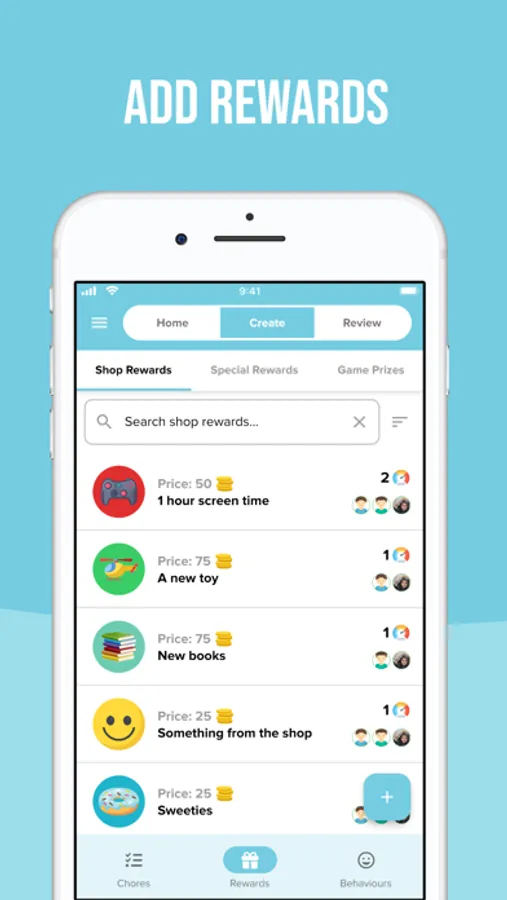 You can easily create chores, specify the recurrence of the chore and assign it to your kids. You can also create rewards and specify the number of coins required to purchase that reward.