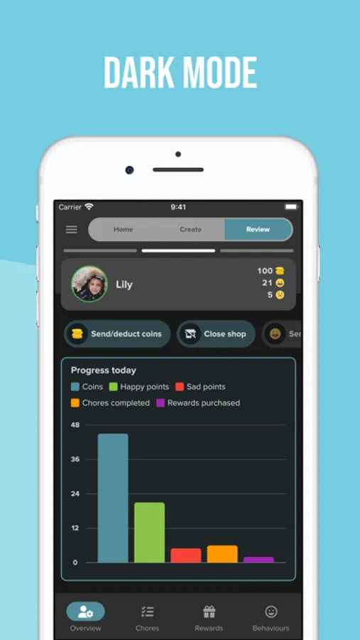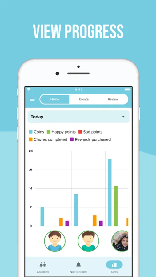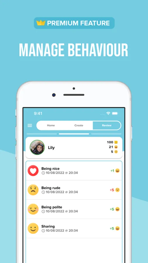 With the behaviors & points system, you can create behaviors and specify how many happy/sad points each behavior is worth. Behaviors can be sent to children in review mode, which will then add the total number of points to their account.