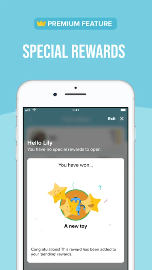 Send your children a special one-off reward in the form of 'scratch to reveal'. Enter the reward name, pick a photo or icon and optionally enter the reason for the reward. The next time your child enters child mode, a surprise reward will be waiting for them!
