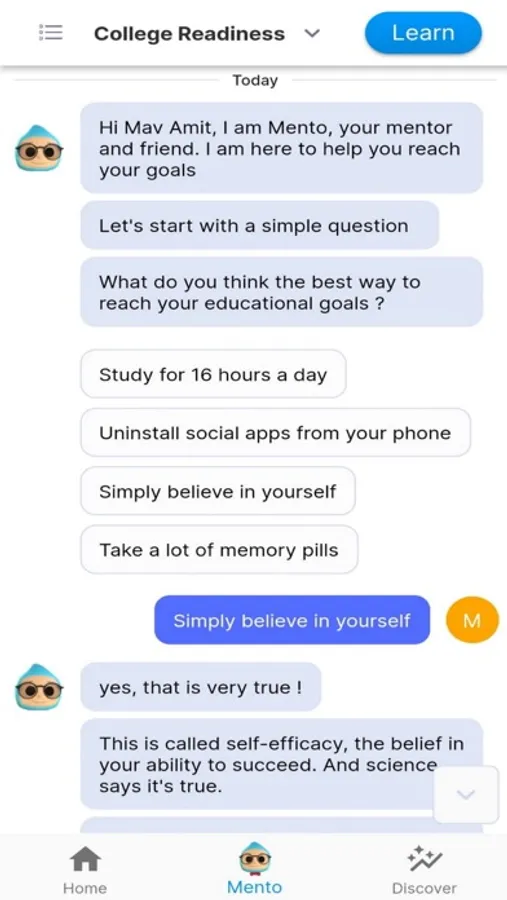 This app is a personal learning companion for students to help them reach their next milestone. The app uses an AI chatbot to deliver small-sized learning, continuous engagement and behavioral motivation to help students progress towards their goals. The app supports academic, faith-based and social-emotional learning.