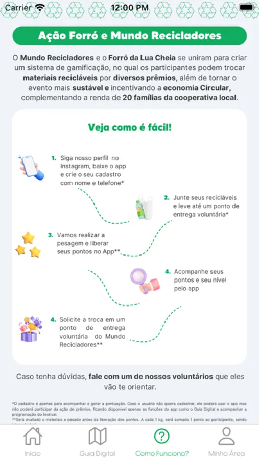 O Mundo Recicladores e o Forró da Lua Cheia se uniram para criar um sistema de gamificação, no qual os participantes podem trocar materiais recicláveis por diversos prêmios, além de tornar o evento mais sustável e incentivando a economia Circular, complementando a renda de 20 famílias da cooperativa local.