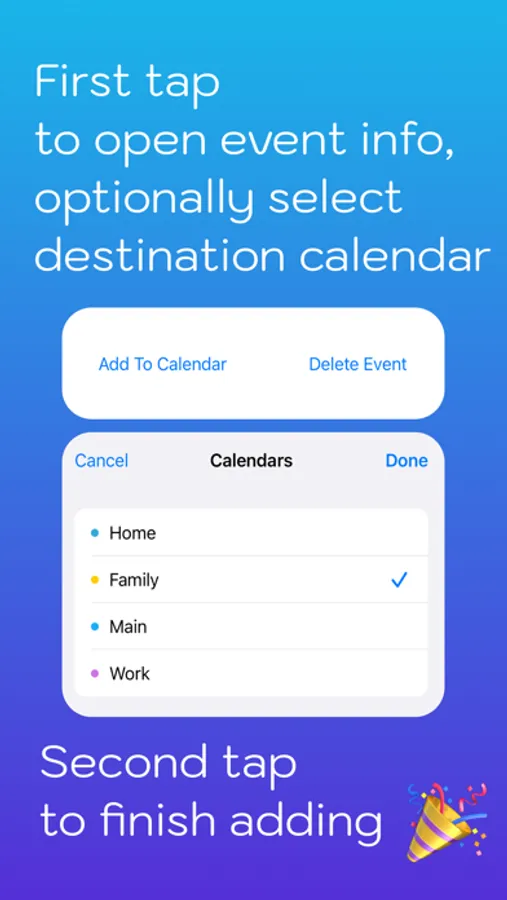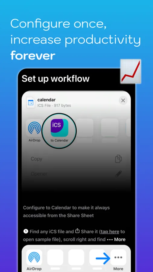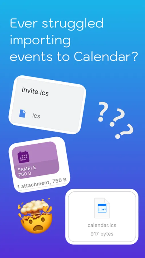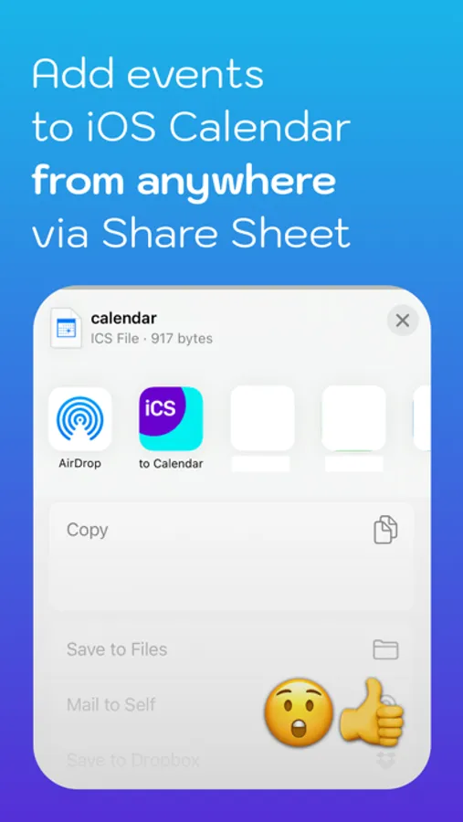 to Calendar is a productivity assistant which helps you to import calendar events (commonly in ics extension file format) into your iOS Calendar from any other app you use easily with just a few taps. Simply select to Calendar from Share Sheet, tap Add to calendar in bottom left corner and you're good to go.