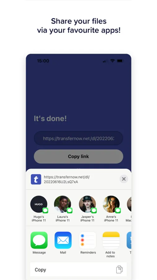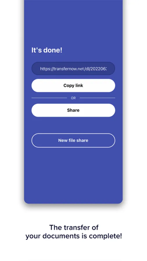 When your file upload is finished, a download link is generated. Share it at your convenience by email, SMS, WhatsApp or via social networks.
