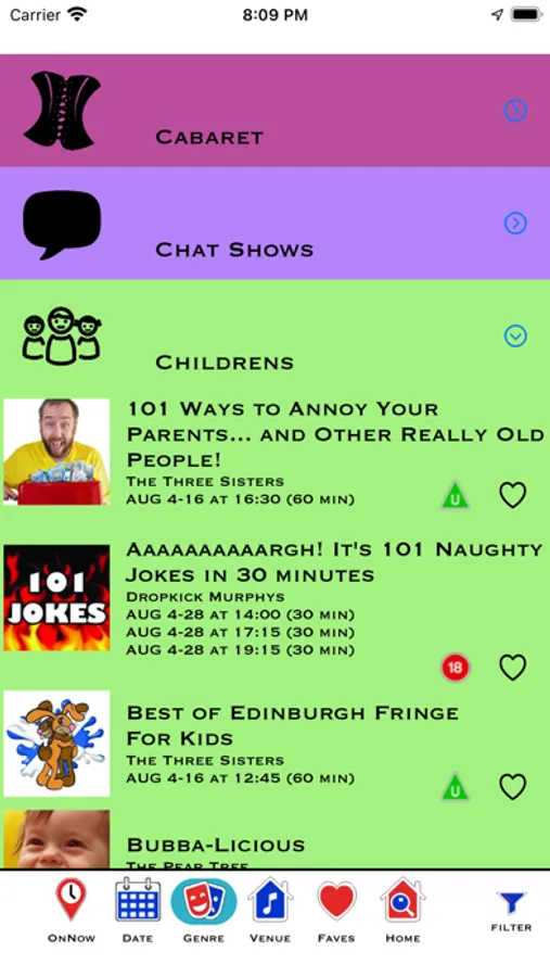 Find shows in a variety of genres, including Comedy, Theatre, Children’s Shows, Chat Shows, Music, Cabaret, Spoken Word, and Musicals.