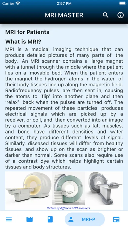 This app provides a clear and easily accessible guide to many of the practical aspects of MRI including MRI protocols, MRI planning, MRI anatomy, MRI techniques, MRI pathologies, MRI artifacts and much more.