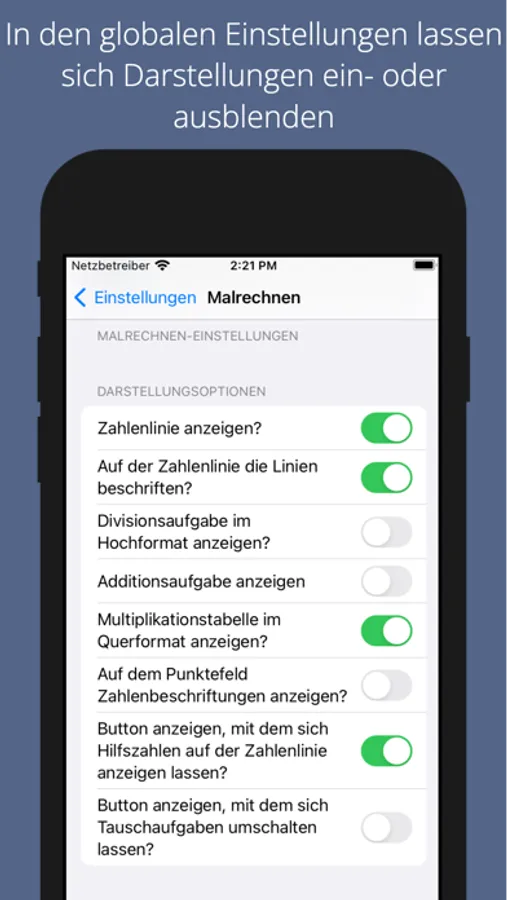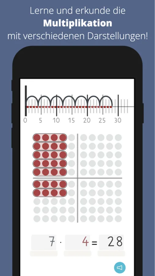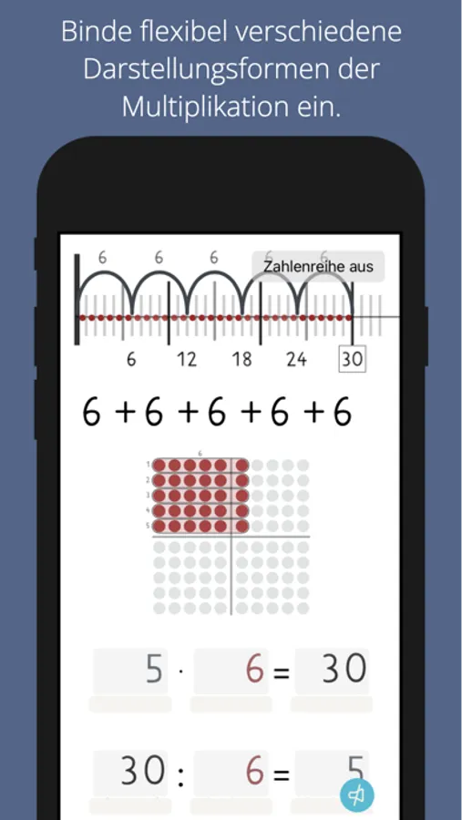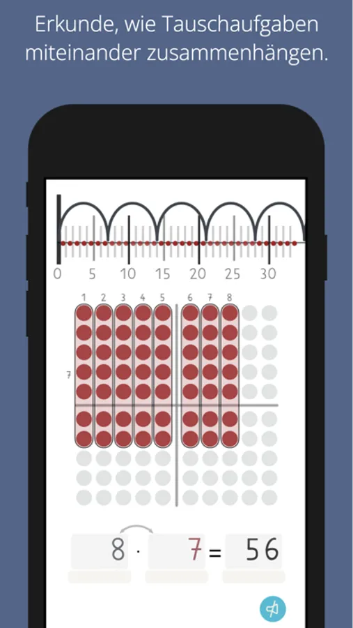 Mit der App können Multiplikations- und Divisionsaufgaben gelegt werden und Zusammenhänge zwischen Aufgabe, Darstellung im Malfeld, Zahlenlinie und Divisionsaufgabe hergestellt werden. Die verschiedenen angebotenen Darstellungen sind immer direkt miteinander verknüpft.