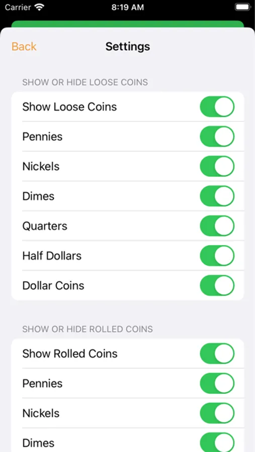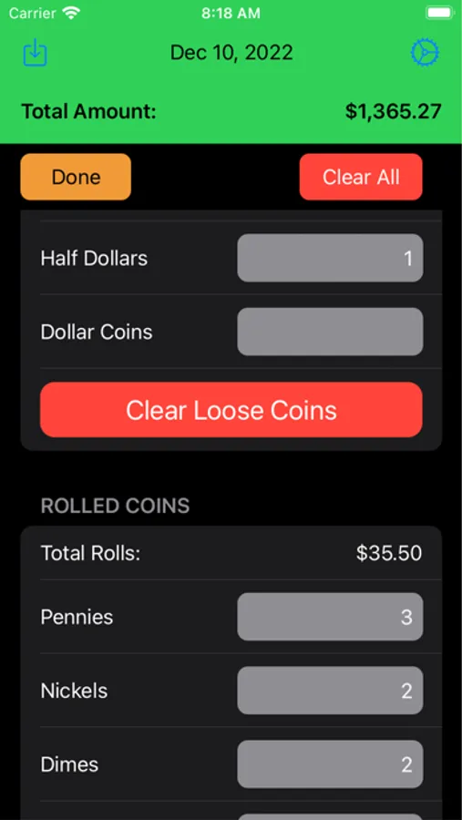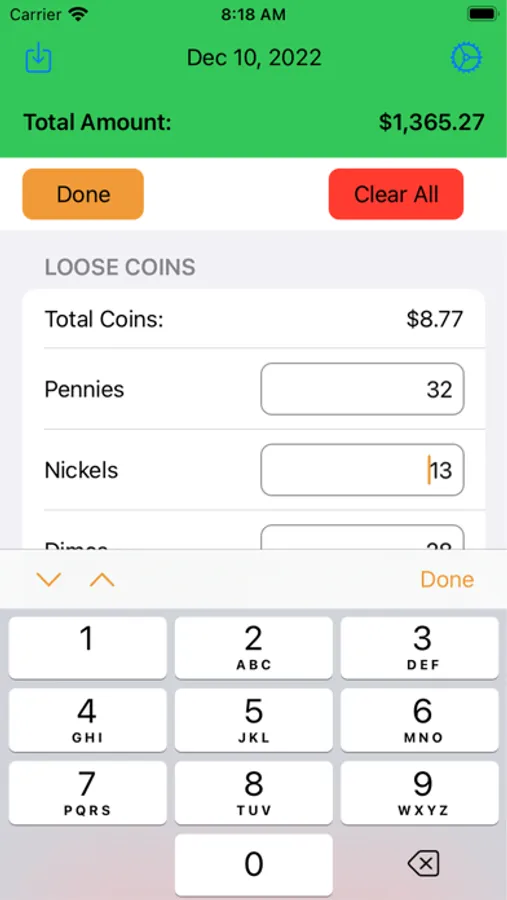 Cash Count Deluxe lets you enter quantities of each type of US currency and calculates a total as you type. Currency types include obscure half dollar and collar coins as well as 2 dollar bills, but if you don’t deal with those, they can be toggled on or off. If you end up with any of them on a particular day, turn that option on for that day only, Cash Count Deluxe will save it to that day’s report without effecting existing reports or needing to turn it back off for the next one.