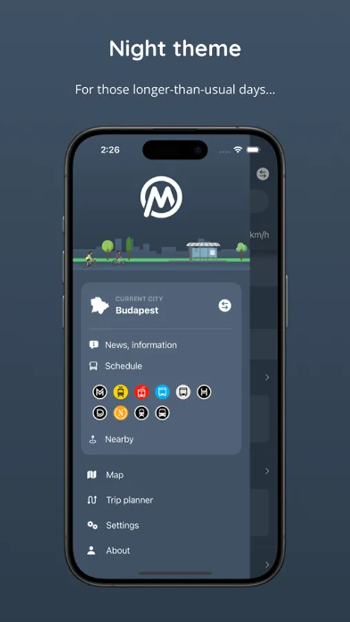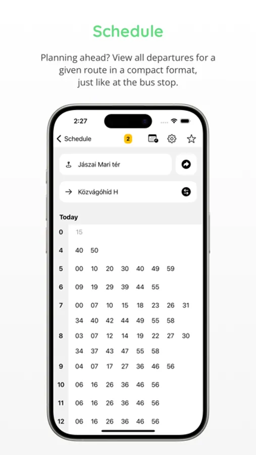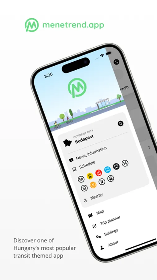 Public transit schedule and route planner application for 75 Hungarian cities: Ajka, Baja, Balassagyarmat, Balatonfüred, Balatonfűzfő, Balmazújváros, Bátaszék, Bátonyterenye, Békés, Békéscsaba, Berettyóújfalu, Bonyhád, Budapest, Csongrád, Csurgó, Debrecen, Dunaújváros, Eger, Ercsi, Esztergom, Fonyód, Gödöllő, Gyöngyös, Győr, Gyula, Hajdúszoboszló, Hódmezővásárhely, Jászberény, Kaposvár, Karcag, Kazincbarcika, Kecskemét, Keszthely, Komárom, Komló, Körmend, Lenti, Makó, Mezőberény, Mezőtúr, Miskolc, Mohács, Mórahalom, Mosonmagyaróvár, Nagyatád, Nagykanizsa, Nyíregyháza, Orosháza, Oroszlány, Ózd, Pápa, Pécs, Püspökladány, Salgótarján, Siklós, Siófok, Sopron, Szeged, Székesfehérvár, Szekszárd, Szentes, Szigetvár, Szolnok, Szombathely, Tamási, Tata, Tatabánya, Tiszafüred, Tiszaújváros, Újszász, Vác, Várpalota, Veszprém and Zalaegerszeg.