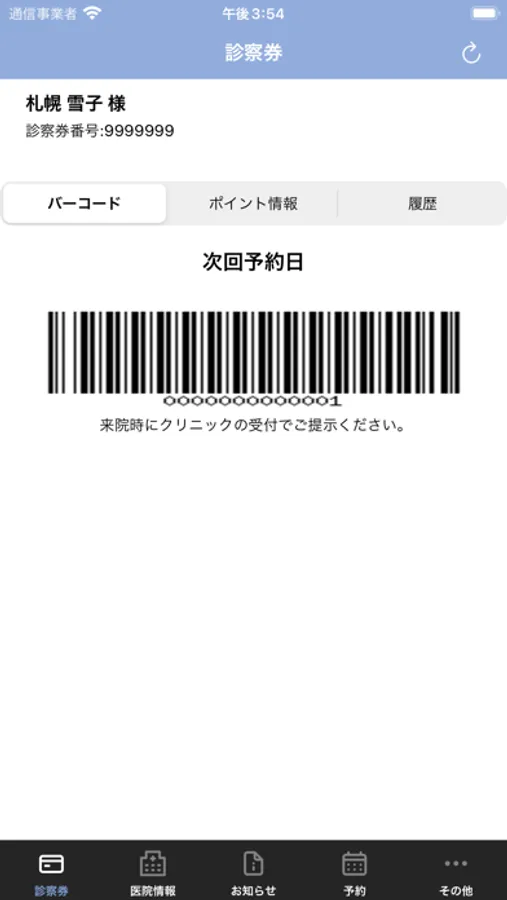 バーコードをかざすだけで受付出来るチェックイン機能、次回ご予約日時表示など、カードレスな診察券としてご活用頂けます。