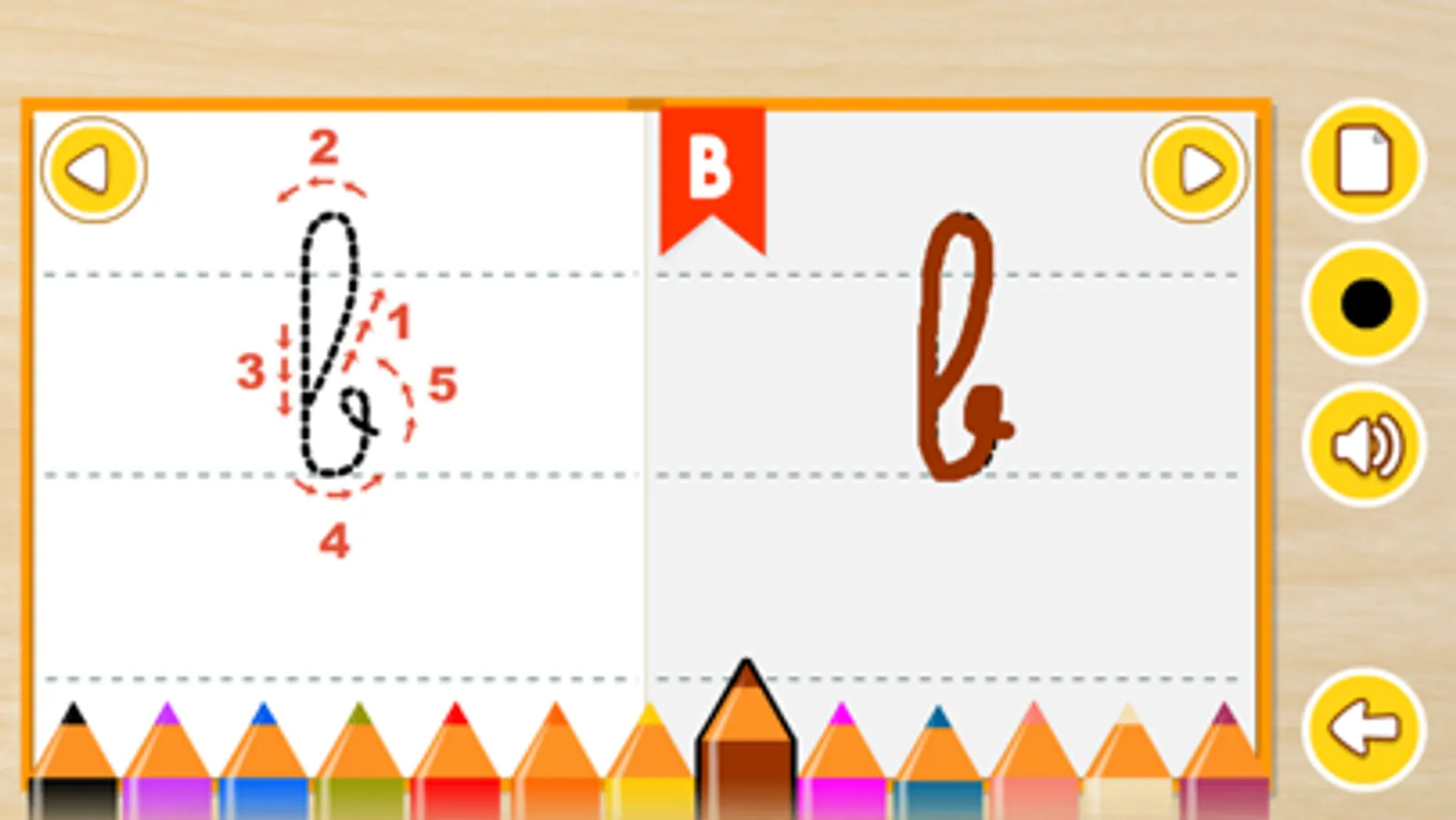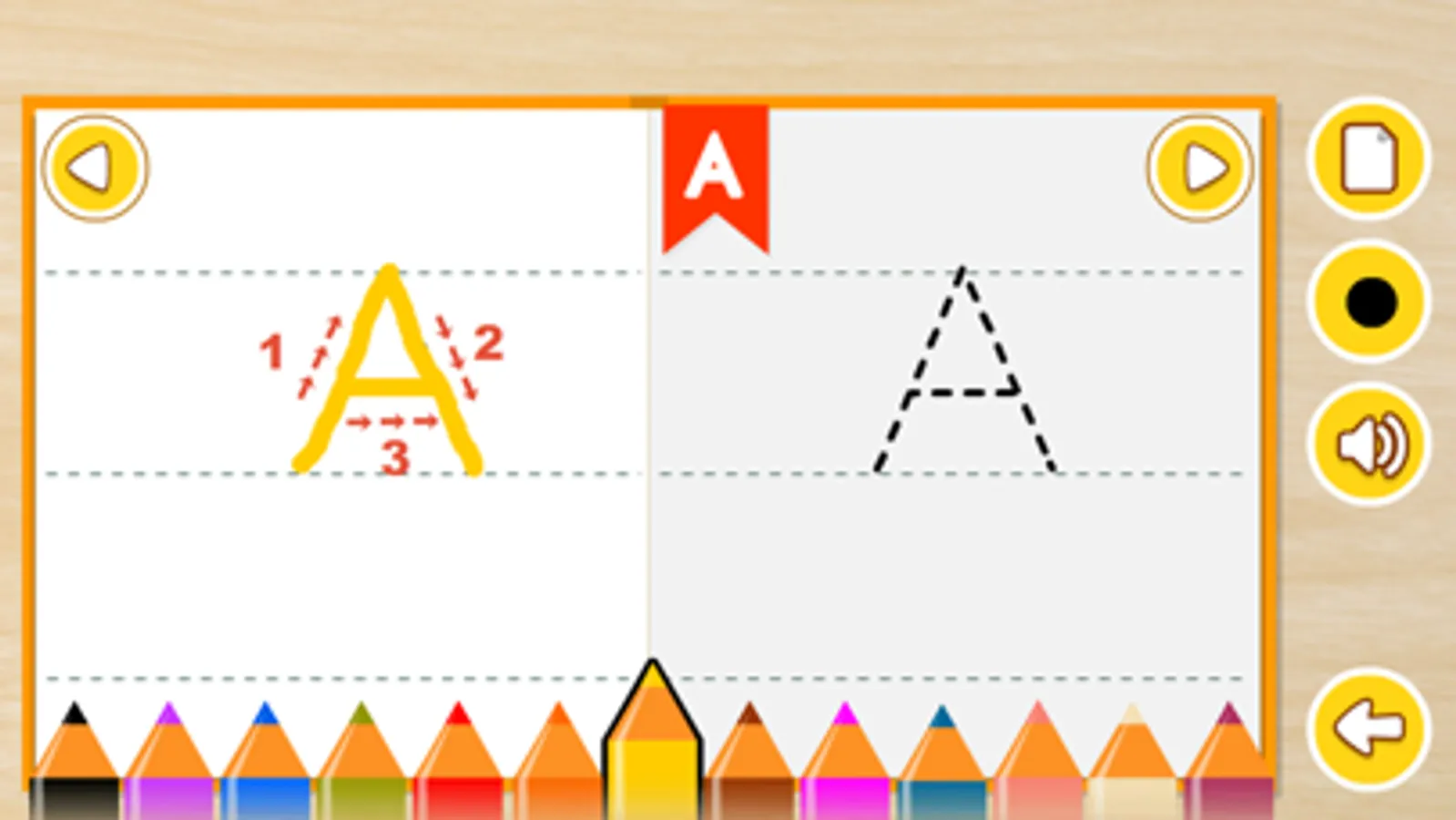 تعلم كتابة الحروف : يوفر التطبيق برنامج متكامل لتعلم كتابة الحروف الصغيرة حيث يمكن للمستعمل الكتابة مباشرة على الشاشة باستعمال يده او باستعمال قلم خاص بالشاشات اللوحية ، كما تعطي امكانية تغيير لون الخط ، سمك الخط ، تعلم طريقة و جهة الكتابة و مباشرة سماع نطق الحرف ،