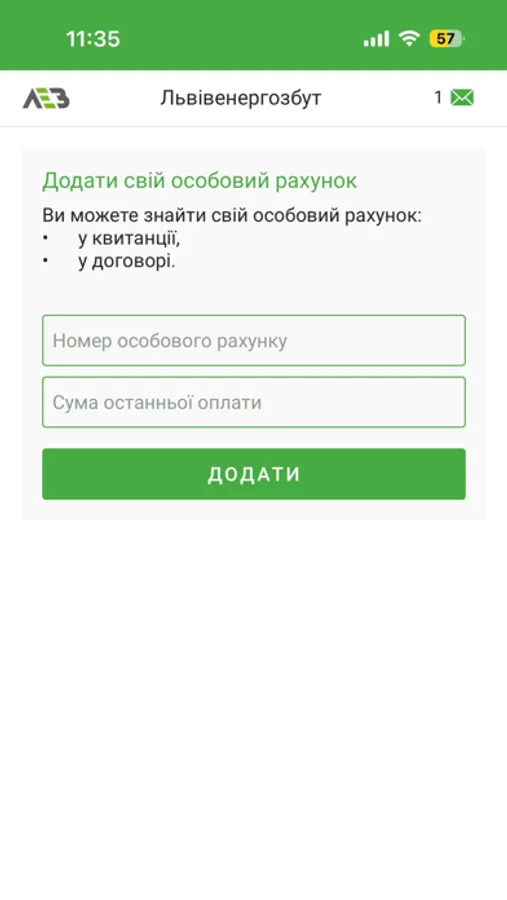 - після реєстрації додайте свій особовий рахунок, вказавши суму останньої оплати. Ви можете додати декілька особових рахунків;