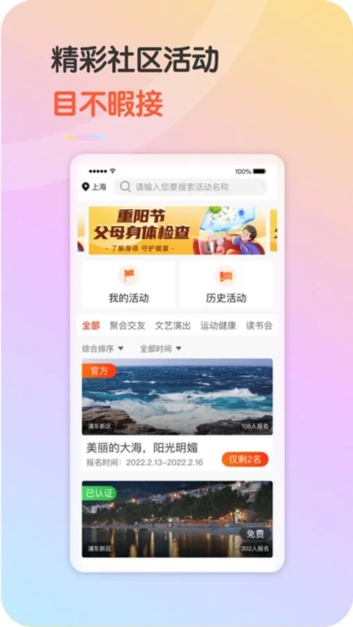 10多种活动类型,包含健康养生、户外运动、公益行动、音乐、话剧等,消灭无聊,满足中老年人各种精彩生活所需。
