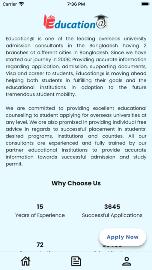 Education@ is one of the leading overseas university admission consultants in the Bangladesh having 2 branches at different cities in Bangladesh. Since we have started our journey in 2008; Providing accurate information regarding application, admission, supporting documents, Visa and career to students, Education@ is moving ahead helping both students in fulfilling their goals and the educational institutions in adoption to the future tremendous student mobility. Education@ committed to providing excellent educational counselling to student applying for overseas universities at any level. We are also promised in providing individual free advice in regards to successful placement in students’ desired programs, institutions and counties. All our consultants are experienced and fully trained by our partner educational institutions to provide accurate information towards successful admission and study permit. This App will help students to asses their qualification and find their desired overseas Education destination.