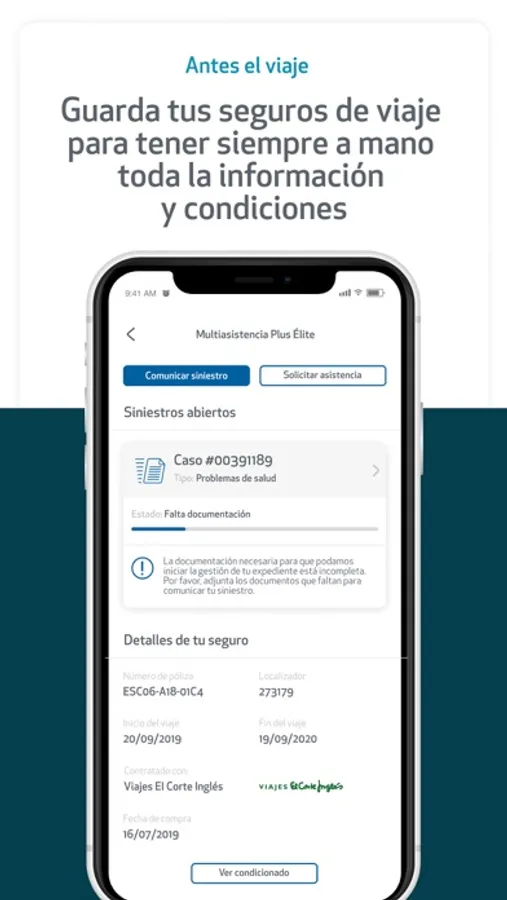 - Durante el viaje: solicita asistencia en sólo un clic, por teléfono, chat o servicio de telemedicina. Estés donde estés y en tu idioma. Además, si has sufrido alguna incidencia, podrás consultar qué documentación necesitarás reunir y presentar para gestionar el reembolso.