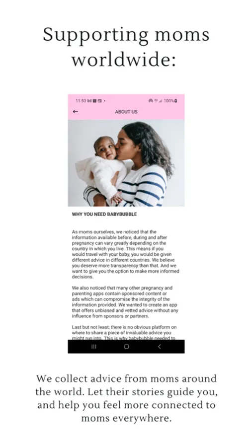 With babybubble you have access to advice and stories from mothers around the world on everything from conception, maternity care and childbirth, to postpartum recovery, breastfeeding and parenting.