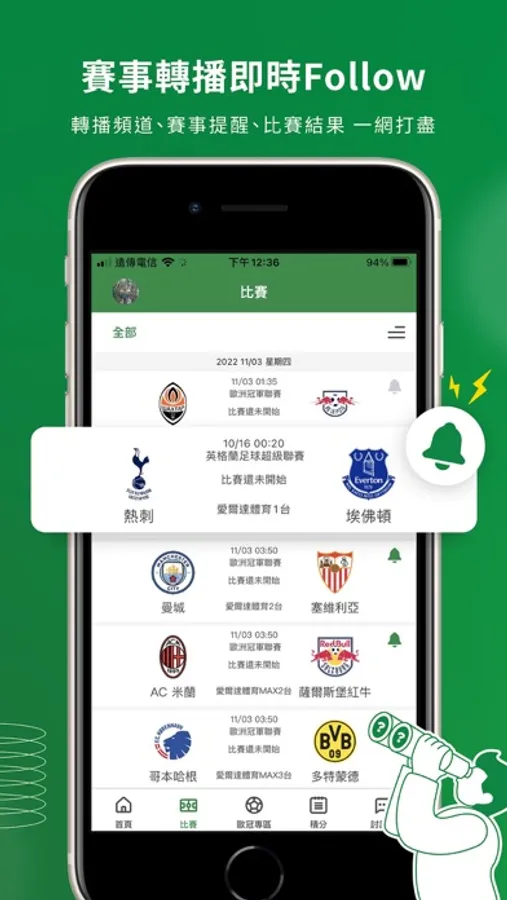害怕錯過精彩的比賽嗎?追蹤你關注的賽事,挺足球將會在比賽開踢前即時通知。
