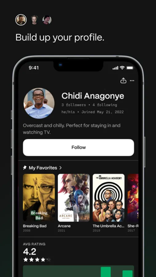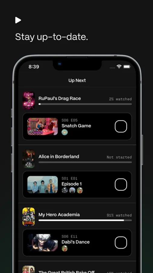 With the Up Next page, you can stay up-to-date with the series you're currently watching. Develop your profile and build up your stats, like average rating, episodes watched, and total time watched.
