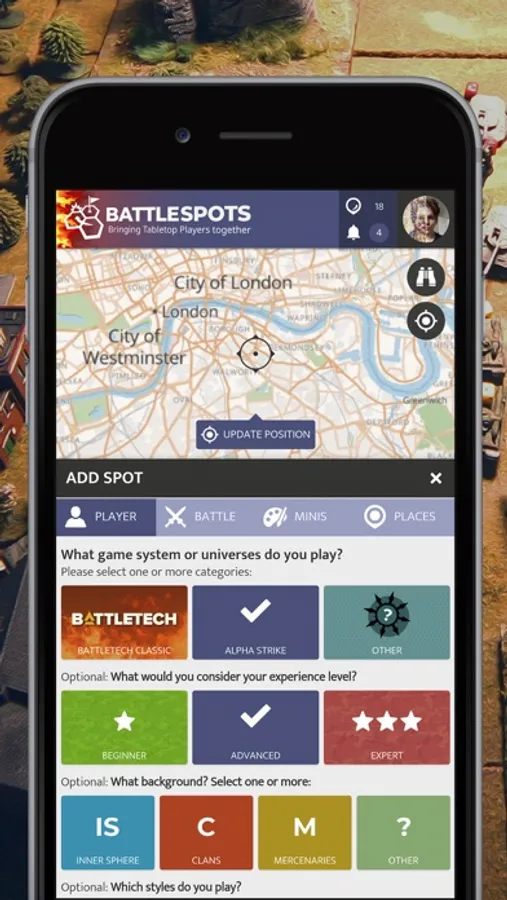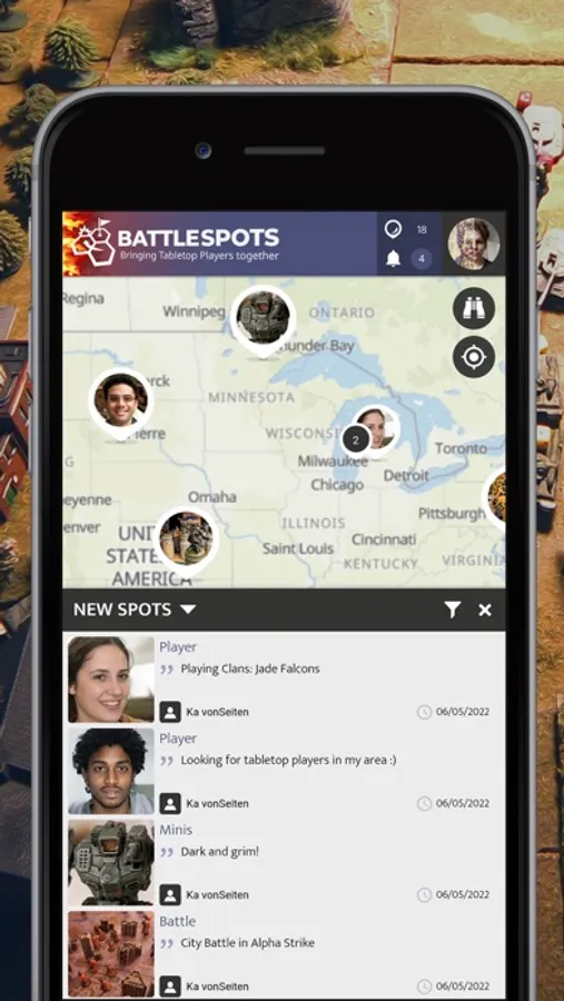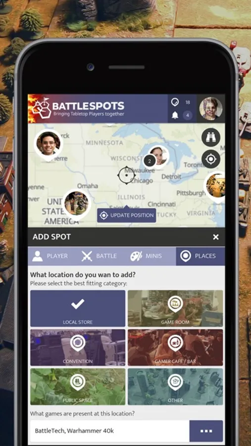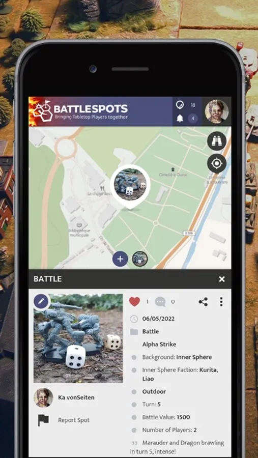 A whole social community enables you to get in contact via a comment at each entry. You can tag other Tabletop players in the App by writing @username, and the other person is instantly informed of your comment via push notification and can get back to you. Other community functions are ready for you and your activity. Download the BattleSpots App and join us!
