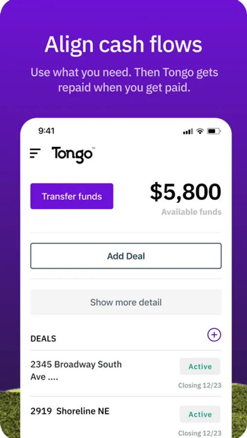 Align cash flows: repay when you get paid. Unlike traditional lending products that require payments on a set schedule, Tongo gets repaid when you get paid. That remains true if your deal is delayed. If your deal falls through, you can just repay with the next one.