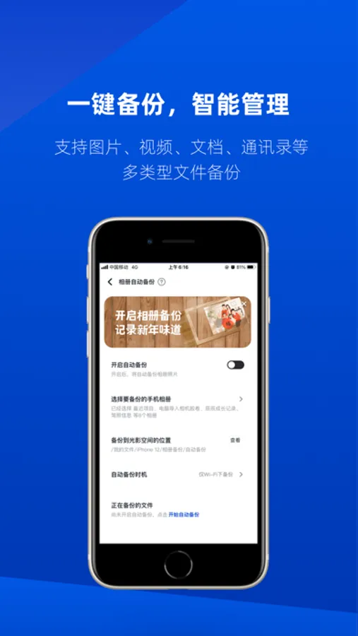 提供海量存储空间,支持手机相册和通讯录一键备份