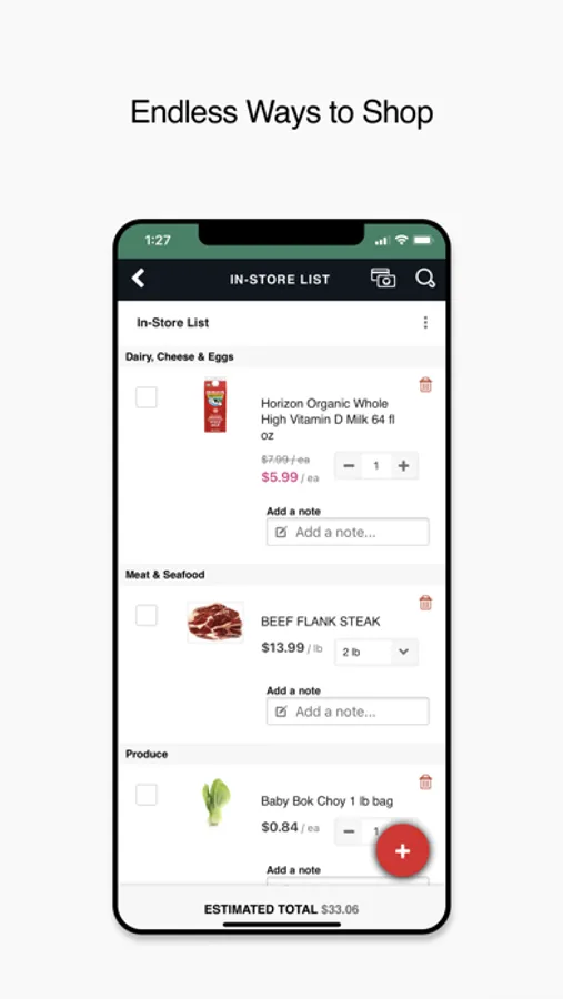 This feature groups future purchases together for shopping convenience! Add items from anywhere in the app. Easily check off items as you go throughout the store!