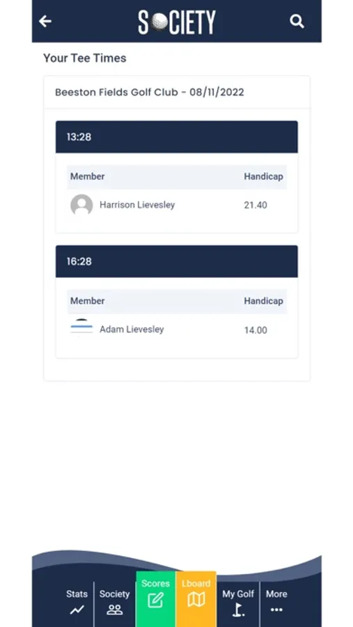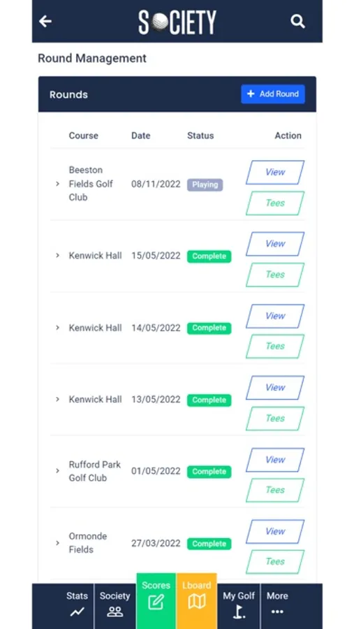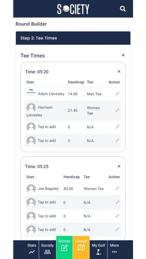 You can create rounds for your societies, set them against certain courses which will prefill information such as pars and indexes or add a new course to our app if we don't already have it. You can then add an unlimited amount of tee times which you can assign your society members to.