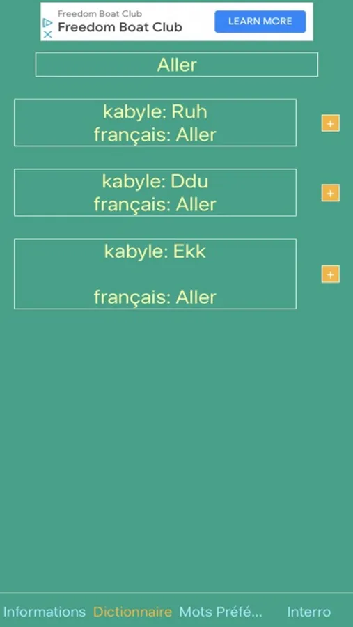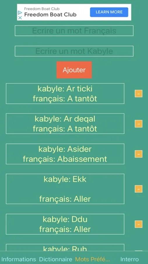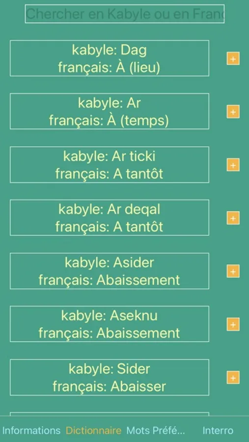 Le Kabyle (Taqbaylit) est une langue berbère du nord parlée en Kabylie (région du nord de l'Algérie) et également au sein de l'importante diaspora kabyle, en Algérie et dans d'autres pays (notamment la France et la Belgique). Le nombre de locuteurs est estimé à environ 3,5 millions en Kabylie et à environ 6 millions dans le monde, essentiellement à Alger et en France. Il s'agit de la deuxième langue berbère la plus parlée, après le chleuh (Tachelhit) (sud du Maroc). Veuillez utiliser ce dictionnaire Français-Kabyle pour chercher des mots dans les deux langues. Ce dictionnaire se compose de ~5000 mots. On peut ajouter des mots à sa propre liste de mots préférés aussi et faire un petit interro pour pratiquer. On peut ajouter ses mots personnalisés aussi.