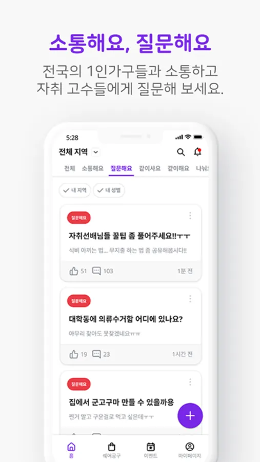 - ‘소통해요, 질문해요’ : ‘이번달 식비는 어떻게 줄이지?’, ‘이건 어떻게 보관해야 할까?’, ‘우리집 근처에 괜찮은 세탁소는 어디있지?’ 궁금한 것은 자취 고수들에게 질문해 보세요. 나와 비슷한 고민을 하고 있는 전국의 1인가구들과 소통할 수 있어요.