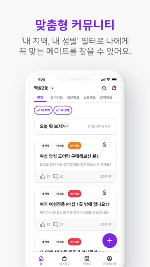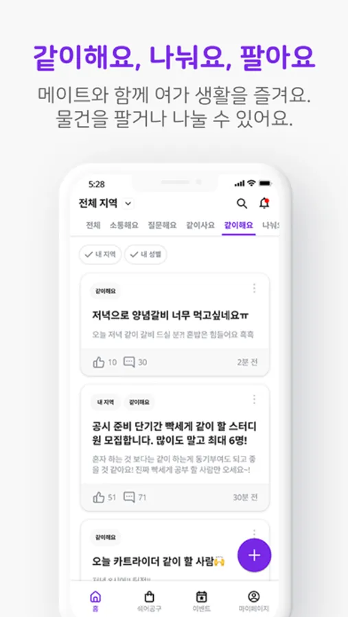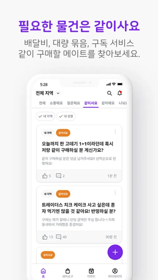 - 필요한 물건 '같이사요' : 양파 한망은 필요 없을 때, 배달비 최소 주문금액이 부담될 때, 구독 서비스를 혼자 사용하기 싫을 때, 같이 구매할 메이트를 찾고 나에게 딱 맞는 소비생활을 할 수 있어요.
