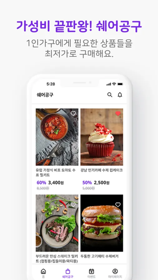 - 여러분이 자주 구매하는 밀키트, 식자재, 생필품 등 1인가구에게 필요한 상품들을 최저가로 구매해요. 업체 할인에 쉐어타운 추가 할인을 더해서 시중가보다 더욱 저렴하게 구매할 수 있어요.