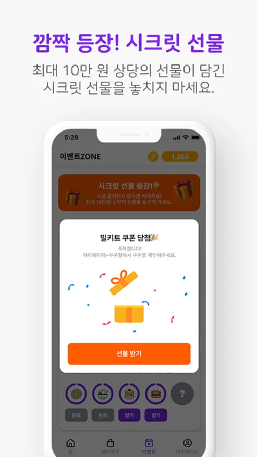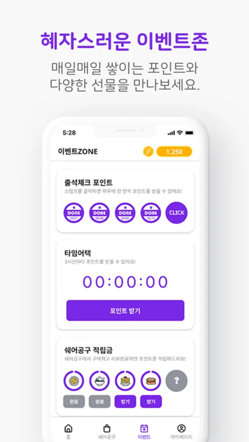 - 매일매일 쌓이는 포인트와 선물을 만나보세요. 출석체크, 시크릿 선물, 쉐어공구 적립을 받다 보면 어느새 포인트가 한가득!