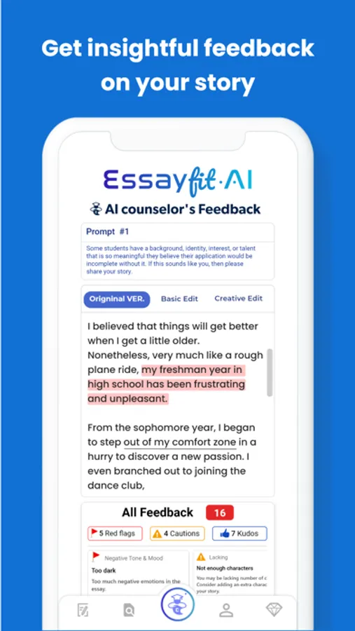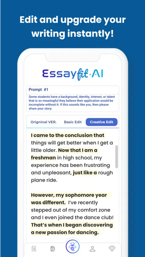 Pre-trained with accepted students’ essays, our AI will provide effective edit suggestions to enrich your essay’s plot and detail.