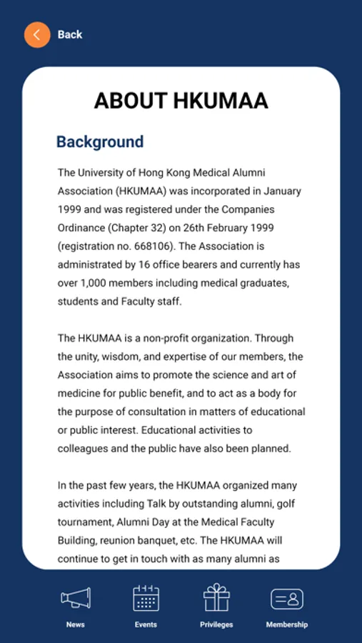 The University of Hong Kong Medical Alumni Association (HKUMAA) was incorporated in January 1999 and was registered under the Companies Ordinance (Chapter 32) on 26th February 1999 (registration no. 668106). The Association is administrated by 16 office bearers and currently has over 1,600 members including medical graduates, students and Faculty staff.