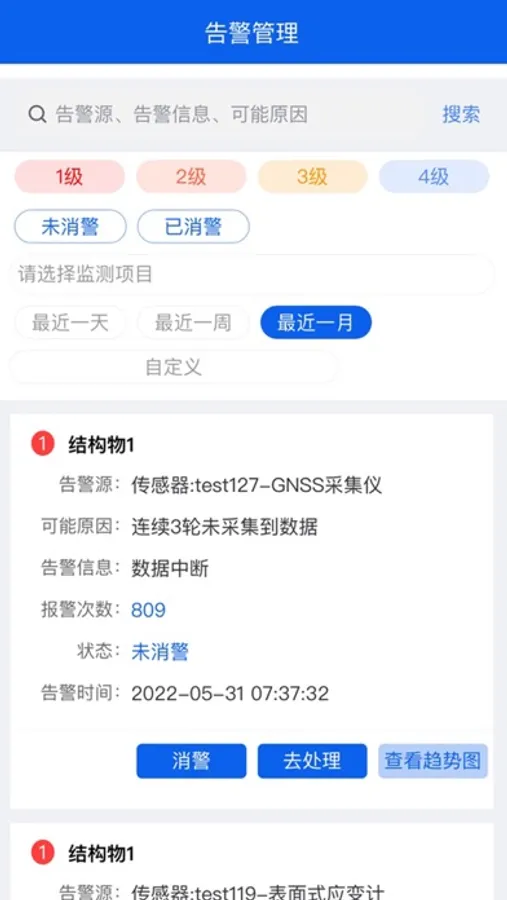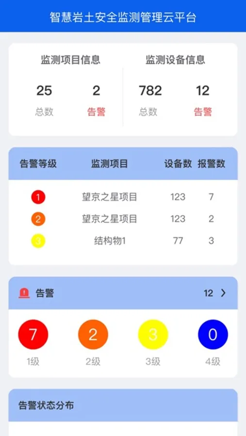 智慧岩土APP版通过简洁的页面实现项目监测信息查看操作,用户可以准确定位所分管项目监测安全情况;满足用户快速的完成在线监测的数据查看、告警协作处理等基础功能;可查看历史处理记录,可修改个人基本信息。功能模块包括1、当前用户所属监测项目和告警信息、项目详细信息、各级告警分布、所属监测项目信息列表的展示;2、显示用户所属项目下所有设备的告警信息、可消警、去处理、协作和查看趋势图;3、当告警产生后,可以启动一个协作,联系项目相关人员一起处理此项告警;4、当前用户基本信息展示和更新,包括头像、密码、名称、手机和意见反馈。