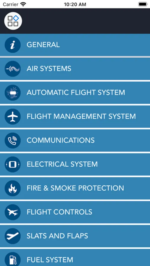General Information, Air Systems, Automatic Flight Systems, Flight Management Systems, Communications, Electrical, Fire & Smoke, Slats & Flaps, Flight Controls, Fuel, Hydraulics, Ice & Rain Protection, Controls & Displays, Recording Systems, Landing Gear, Lights, Navigation, Oxygen, Avionics Network & IMA, Onboard Maintenance System, Information Systems, Air Traffic Control Communications, Auxiliary Power Unit, Doors and Engines.