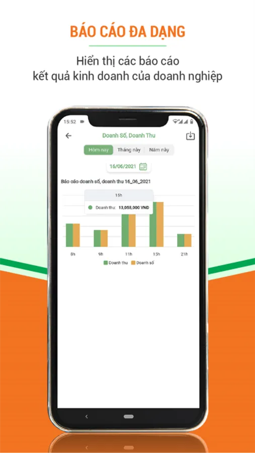 • Báo cáo doanh số, doanh thu hiển thị theo ngày/tháng/năm và trực quan theo biểu đồ, ngoài ra xem giữa các chi nhánh nhanh chóng và tiện lợi.