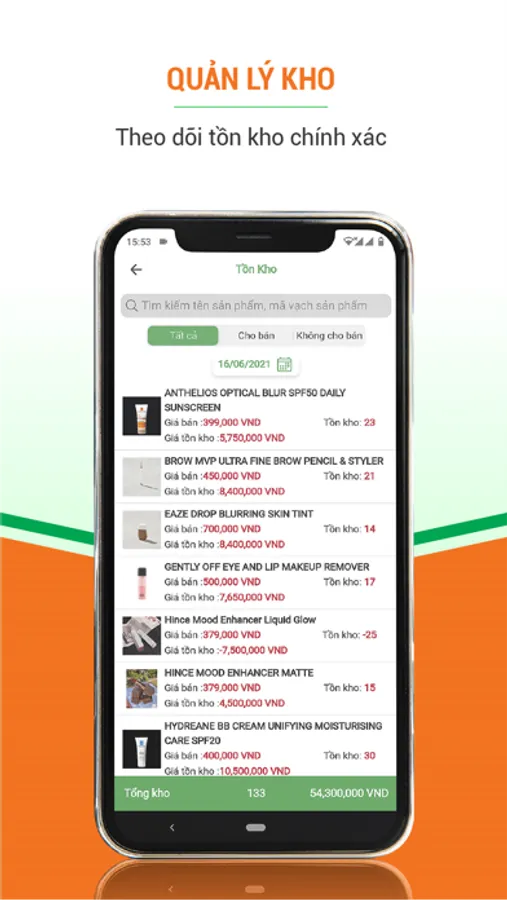 • Tồn kho hiển thị theo thời gian và chi nhánh, phân loại sản phẩm được bán và không cho bán.