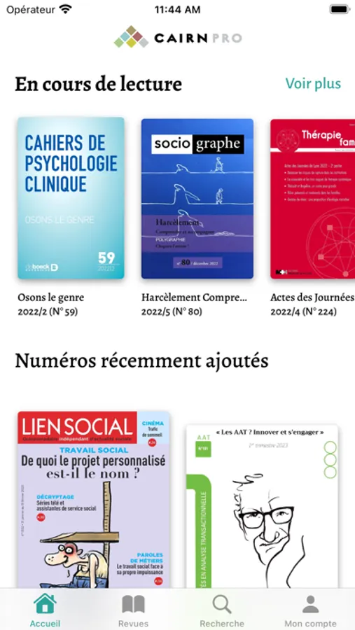 Cairn Pro est une formule d'abonnement personnel au site Cairn .info. Elle est destinée aux professionnels en psychologie, psychanalyse, éducation et travail social. L'application permet aux spécialistes de la santé mentale de chercher, lire et écouter les derniers numéros parus dans les plus de 150 revues de l'abonnement.