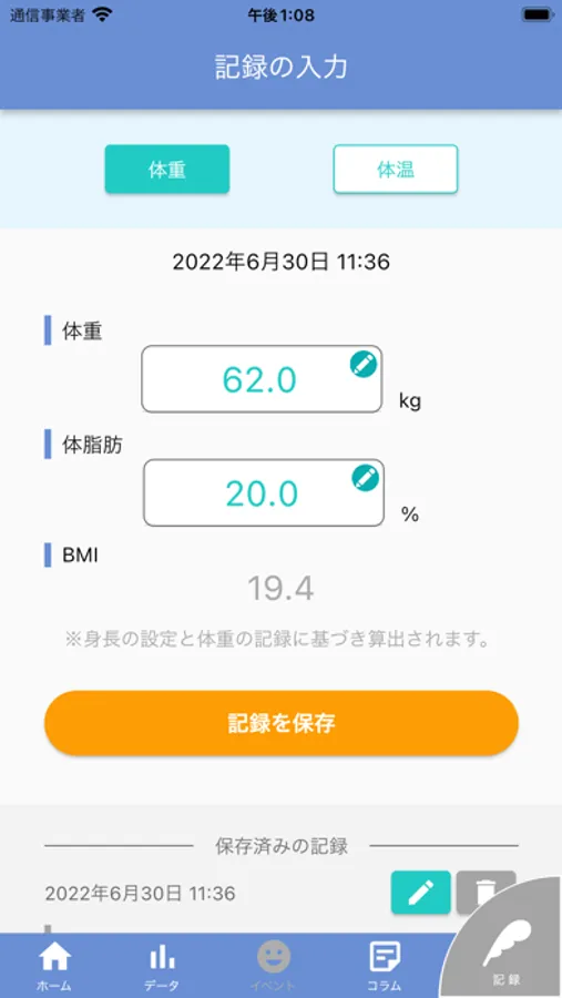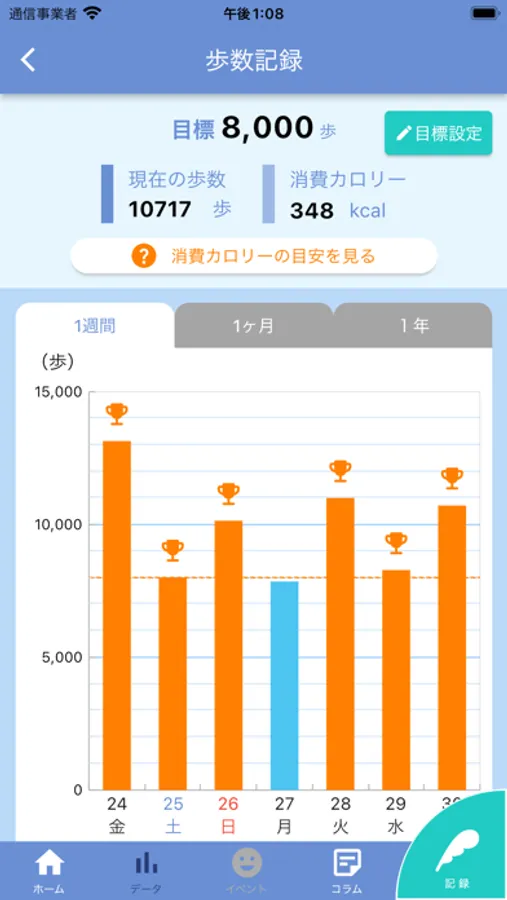 ⇒スマホの歩数データを連携することで、距離や消費カロリーがアプリ上で閲覧できます。歩数の目標達成率に基づく応援コメントで、日々のやる気を引き出します。また、体重からBMIを自動計算のうえ、変化をわかりやすいグラフで可視化します。日々の健康管理も楽々です!