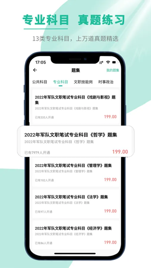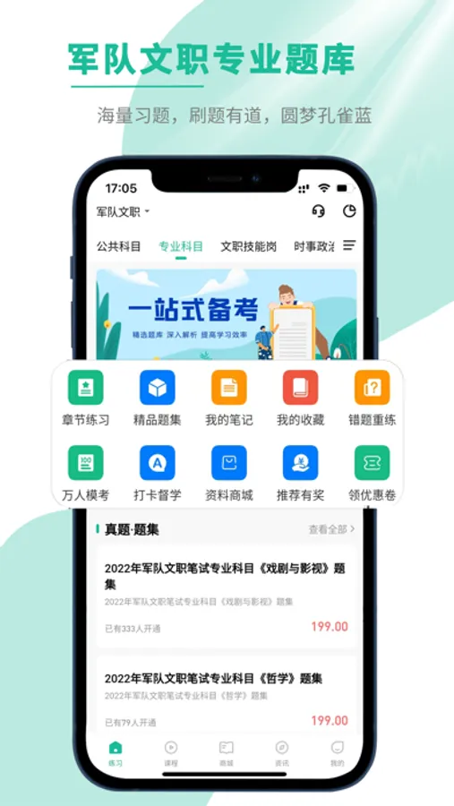 文职帮以军队文职为主要特色、包含文职、军考、消防单招、提干等考试类别,每个类别都有章节练习、精品题集、万人模考、课程精讲、文职资讯、资料商城等丰富的模块以供学习和备考。