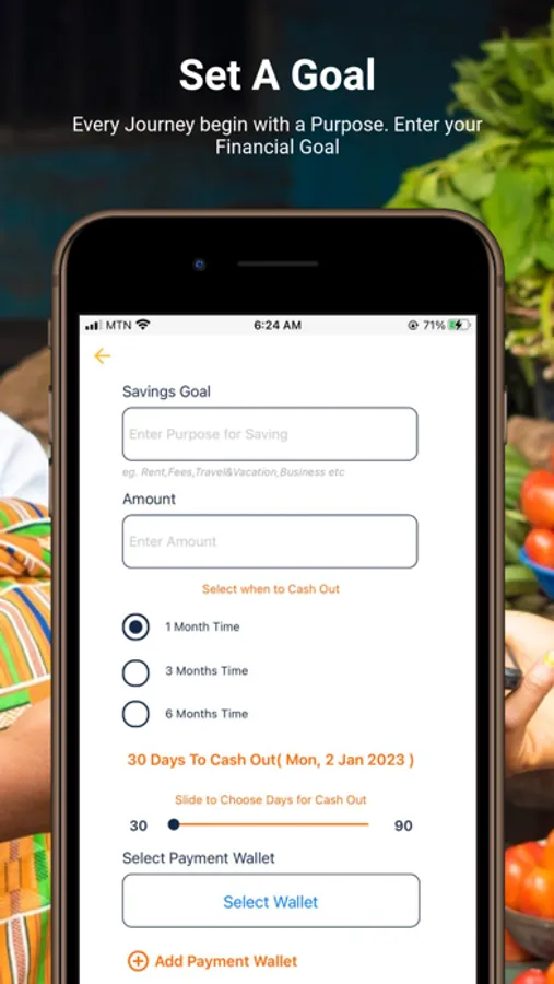 •Cash Out- User can only have access to their funds when the duration is due. Until the due date, user can only Top up or Load their Wallet. Funds are accessible even after the due Date