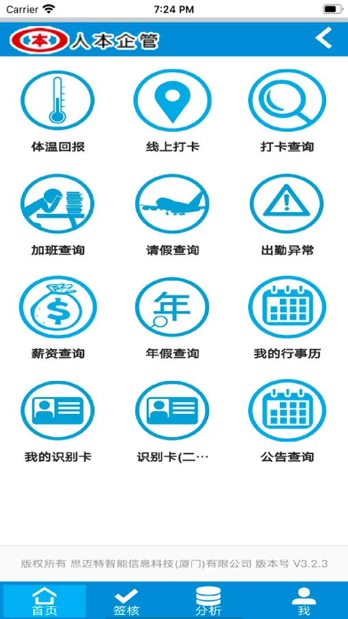 首頁: 體溫回報、線上打卡、打卡查詢、加班查詢、請假查詢、出勤異常、薪資查詢、年假查詢、我的行事曆、公告查詢、識別卡(二維、三維)
