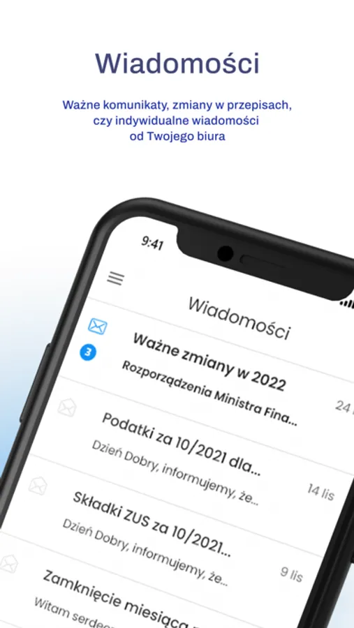 - wiadomości od biura księgowego np. o terminie dostarczenia dokumentów, czy zmianach w przepisach