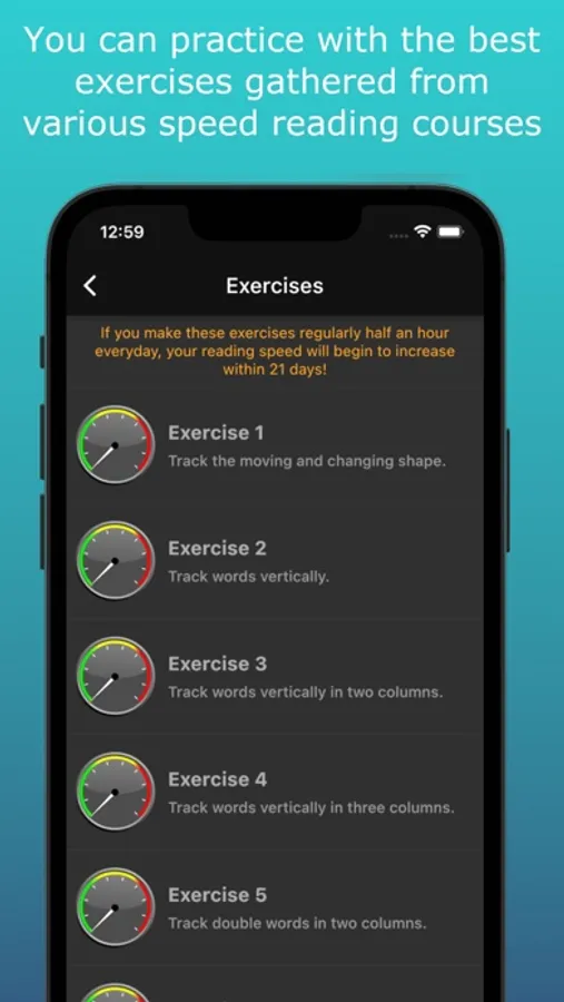 There are 22 different speed reading exercises in the application and each of them has 100 different levels so that any user from beginner to advanced can use large scale of exercises. After you make exercises regularly for 21 day, you will see the improvement in your reading speed. This course is consisted of exercises that are studied in speed courses. Fast Rapid Speed Read