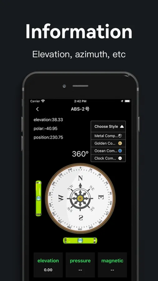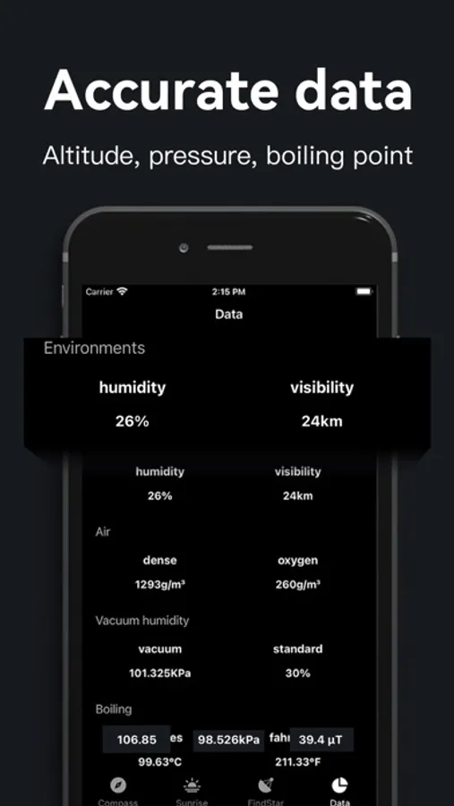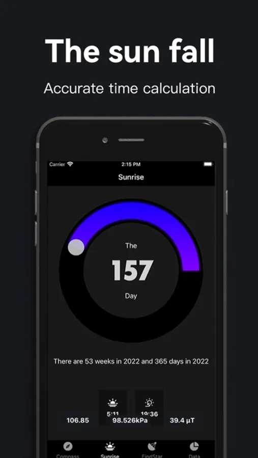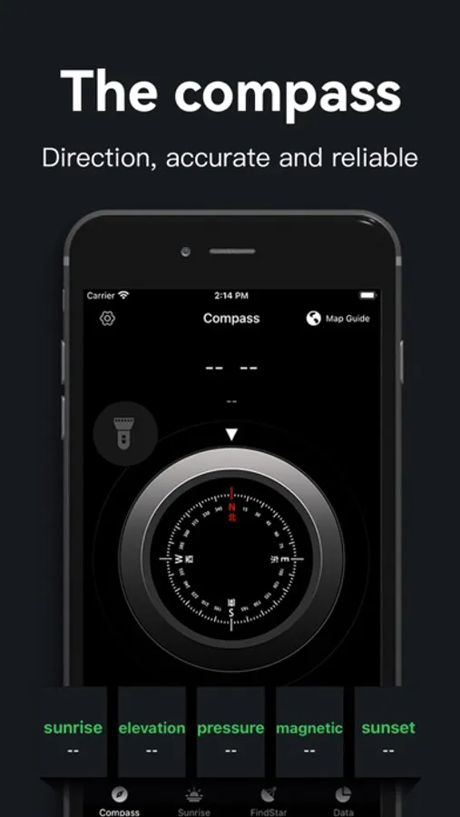 Small memory, low power consumption, flashlight, conventional compass, map guide function, longitude and latitude, annual sunrise and sunset schedule, star searching compass compass, altitude orientation, magnetic field pressure, air quality, professional data of environmental parameters!