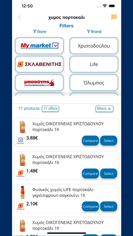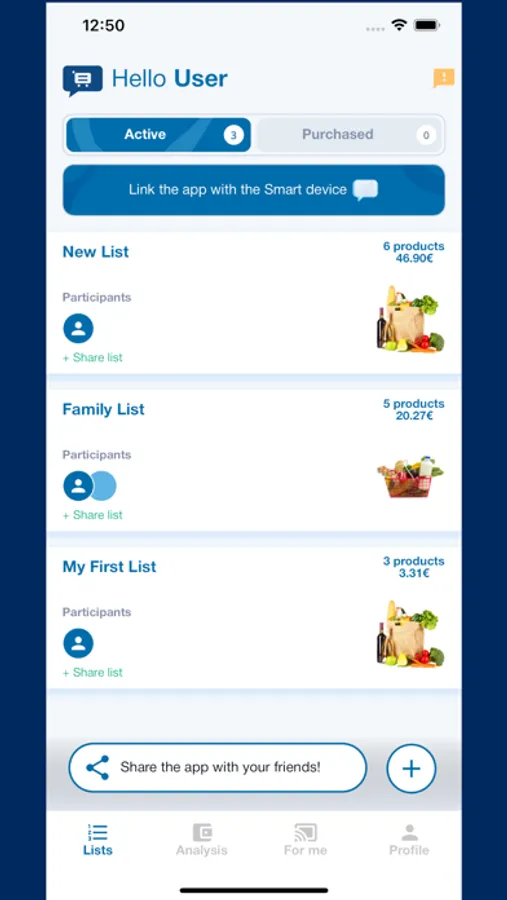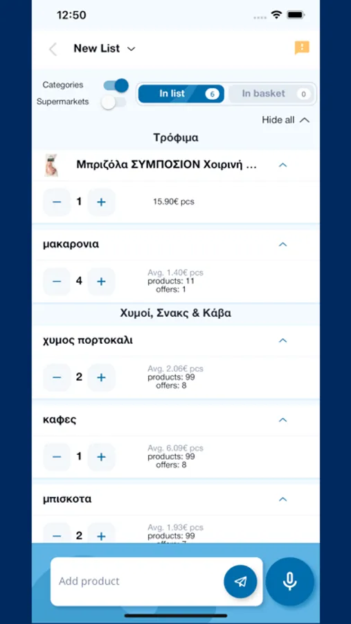 Create and share your shopping lists with other family members. Voice register multiple products together, separating them with the word "And". Eg "Macaroni and Flour and Mayonnaise". The products will be listed separately in your list and you can see prices and offers from all the selected Supermarkets. When you are at the Supermarket, and you put the products in your cart, you can also put them in the app's cart, so you can easily see which products you have left to buy.