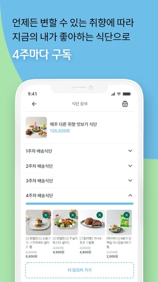 4주마다 지금 내가 좋아하는 식단으로 바꾸며 구독하고, 달라지는 다음 주를 만나보세요!