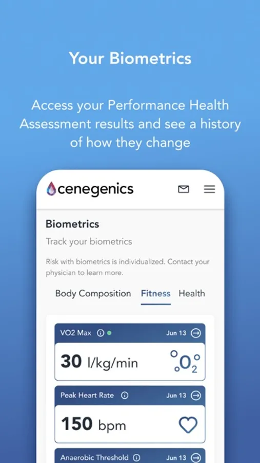 As a global leader in Performance Health Age Management, Cenegenics continues to innovate with our new HIPAA-secure app that supports your transformation to live a longer, more energized life. With our app, you can securely communicate with your Performance Health Team, track your biometric and biomarker performance, manage your regimen with nutraceutical and prescription orders, and view all your labs in conjunction with your Cenegenics Performance Health Program.